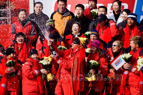 克利伯大帆船環球比賽青島號抵達母港后開啟香檳酒慶祝 郝國英拍攝