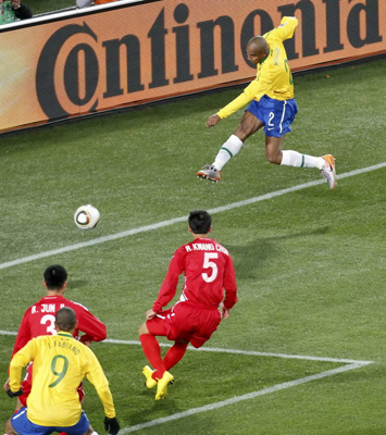 在卡卡、羅比尼奧等進攻球員遲遲打不開局面的情況下,麥孔橫空出世,打破僵局。這個進球之后,擁有了領先優勢的巴西隊打的更加從容。
