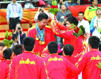 2.16米的身高、115公斤的體重,就算是這些男籃的大個子們拋起來也還有點吃力,但這已經足夠了,這個帶有中國傳統的慶祝動作——大概始于15年前的乒乓球世錦賽,隊員們拋起當時的主教練蔡振華,隨后在中國各級運動隊的重大比賽中,成為了表示對主教練尊重和感謝的傳統慶祝動作——第一次用在了隊員身上,哪怕是姚明,也沒有享受過這樣的待遇。直至拋完王治郅,隊員們才把這種厚愛獻給了主教練鄧華德。當然,鄧華德對此是沒有怨言的,他更清楚王治郅對于他的重要性。比賽前,鄧華德站在場邊和每個隊員擊掌激勵,唯獨輪到王治郅出場時,鄧華德緊緊抱住他。他深知,這是他想要奪冠的最大砝碼,半決賽面對伊朗如此,決賽面對韓國更如此。