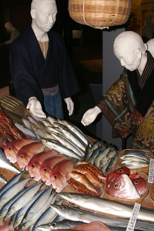 七樓展廳內復原了大大阪時代的街道和人們的生活狀況。館內工作人員介紹說,這里所有的蠟人之所以使用白色涂料,目的是為了和參觀者區分開。的確這里的仿真度非常高,一眼看上去還真是真假難辨呢。不只是人物造型,菜攤上瓜果蔬菜也都相當逼真。
