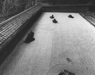 日本的“枯山水”最具代表性的當屬京都的龍安寺石庭,它建造于室町時代末期。那里沒有一草一木,在屋前一塊約一百坪的長方形空地上平整地鋪上白色的砂粒,砂粒上描劃出水的波紋,十五個大小不一的巖石不規則地排列在白砂之中。其景觀有點像浮出海面的島嶼,從前人們稱這座庭園為“虎子渡水庭”,傳說它反映的是幾只小老虎在父母的帶領下渡水的情景。