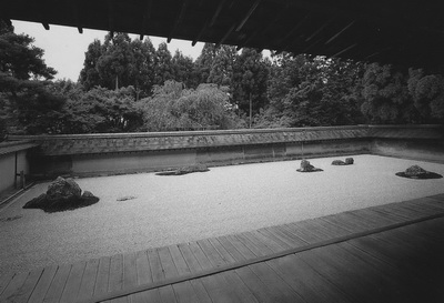 筆者曾兩度去過龍安寺。十幾年前第一次去時,腦子里對枯山水的認識還是一片空白,只感到奇怪,這么一個光禿禿的庭園為何會吸引如此多的游客前來參觀?而且一些人面對庭園一坐就是好長時間,真不明白他們在看什么呢!5年前我再去龍安寺時,感覺就完全不同了,因為我事先對枯山水有了一定的研究,甚至喜歡上了這種獨特的庭園景觀,在我現在的北京住家小院的布置上我還采用了一些枯山水的元素。當我重新面對龍安寺的石庭時,不由自主地也靜坐了下來,讓思緒來了一次隨意的展開。那是一種耐人尋味的感覺,也只有你自己身臨其境,坐下來靜靜觀望、細細琢磨,或許才有所感悟。人們都說龍安寺石庭所包含的意味難以琢磨,也正因為它難以琢磨,才感覺它有一種深奧的精神存在其中。因此可以說龍安寺石庭是日本最神秘莫測、也是最值得細細琢磨的庭園。