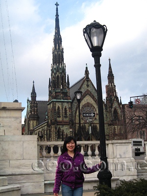 回程中路過一個不起眼的露天小花園,可能總共不過40平方米,并且里面的植物泛黃缺乏修建。但是一塊牌子吸引了我——巴爾迪摩Basilica教堂,這里是美國第一個天主教堂。我走進去,看見一座雕塑,一個大人很慈祥的與兩名兒童相擁。我從后面的石刻上得知巴爾的摩是美國上第一個宣揚宗教寬容的城市,號召人們用寬容的心態接受彼此。我回到塑像前面,祈禱我的愿望成真。