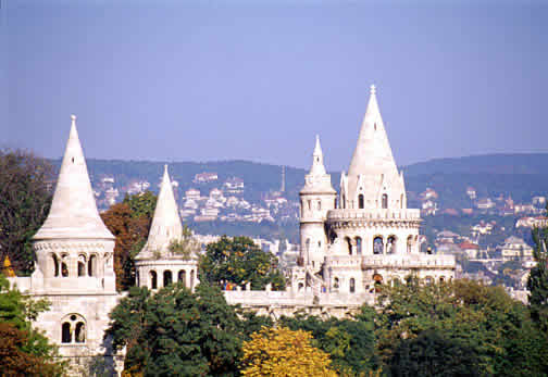 跨過橋,上山,著名的皇宮、加冕教堂和漁夫城堡。漁夫城堡極有特色,晚間猶如沙堡,呈銀白色。建成這種效果的城堡,世所罕見。教堂和皇宮屋頂都是奧匈帝國愛用的彩色瓦頂,排出菱形的圖案。從山頂俯視佩斯,河岸的國會大廈及沿線建筑的壯觀及精美,盡收眼底。