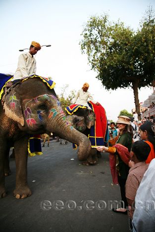 印度的節慶游行完全不像我們在國內看到的那樣整齊劃一、嚴肅認真,說起來更像一個輕松、隨意的流動大Party。游行的演員會因為和周圍觀眾搭訕而掉隊,會因為對著鏡頭擺POSS而亂了節奏;裝扮得花枝招展的大象會因為伸鼻子向觀眾要錢而擠作一團,造成小小的交通堵塞;抬女神像的轎夫們也會因為拾取觀眾扔過來的錢幣而手忙腳亂,轎子都差點抬歪……但這些孩子氣的搞笑舉動,非但不會影響游行的熱烈氛圍,反而為節慶增添了更多歡樂與互動。走過舊城主要街道,表演隊伍漸漸散去,而歡樂的人群繼續簇擁著帕爾瓦蒂女神的塑像繞城游行,直到夜深……