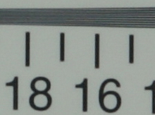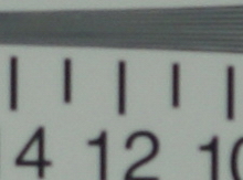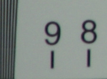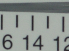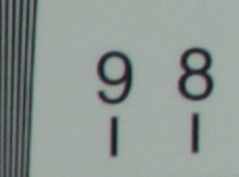 在長焦端光圈全開的情況下,我們可以看到這款鏡頭的橫行和縱向分辨率都比較低。分辨率只有1100左右,本來以為這次由于測試造成的,但是經過幾次測試后發現還是如此,也許是鏡頭的個體差異罷了。如果按照這樣的表現來看,這款鏡頭在長焦端全開光圈下的表現是令人大跌眼鏡的。邊緣部分的色散也比較嚴重,不過令人欣慰的是——中央部分和邊緣部分的光照度相差并不大,也就是說,此時的暗角現象并不算明顯。