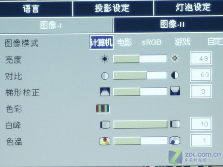 在圖像一選項卡中圖像模式選項分為計算機、電影、sRGB、游戲、自定義五種模式,亮度與對比度均可調整,梯形校正也非常的容易,色彩、白峰與色溫選項也可獨立調節。