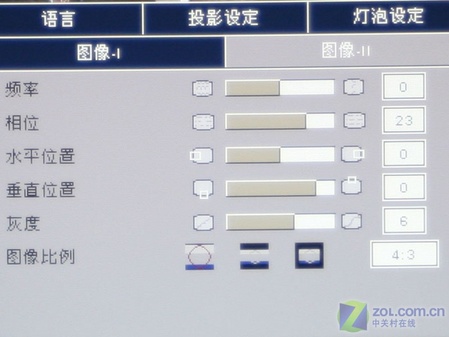 在圖像二選項卡中用戶可以根據實際情況來調整畫面的水平位置及垂直位置,圖像比例可以調為4:3或16:9。更多設定可以調整頻率、相位和灰度。