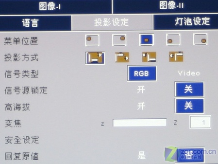 投影設定選項卡中用戶可以根據實際情況來調整畫面的水平位置及垂直位置,投影方式可選擇正投、背投、吊投或吊背投,信號類型可以選擇RGB或者Video,回復出廠設置也在這個選項卡中。