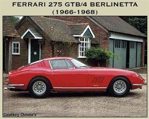 法拉力于1966年推出的275 GTB/4 Berlinetta。GTO是一款超越所有前者的最好的跑車,但是275 GTB/4增加了其舒適度和一個完全獨立的懸掛系統。一個世紀以來,當引擎的雙凸輪軸設計還處于頂峰位置時,275 GTB/4卻大膽的啟用了4凸輪軸的設計。當8000轉的馬力還被大家所推崇時,275 GTB/4卻領先日本數十年的引領潮流的開發高轉速汽車。