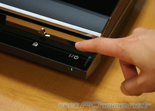 這次PS3采用了觸摸式電源開關,只要輕輕的碰一下電源就會啟動。下方的指示燈一共有三種變化,接通電源后下方紅燈亮起,系統啟動后變為綠色,當光盤插入光驅后左側的藍色指示燈會閃