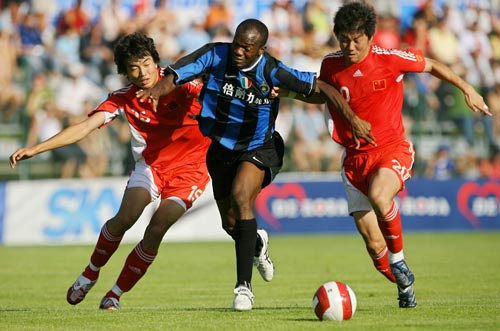 面對國際米蘭這樣的強隊,國奧的小將們踢得積極主動毫不腳軟。15分鐘,國米禁區內一片混戰后球被解圍,禁區外的崔鵬侯個正著,停球后一腳大力遠射,球高出橫梁。第21分鐘,國奧隊又打出精彩配合,右路幾次連續短傳后球轉移到左路,陳濤邊路突破后橫傳門前,21號呂征躍起頭球攻門被后衛破壞,插上的姜寧補射稍慢被托爾多倒地把球沒收。