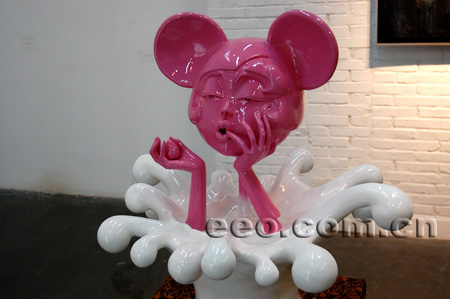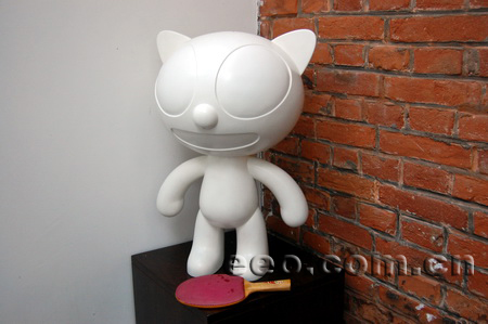 和其他與卡通有關的展覽不同,這里的展覽將卡通的氛圍進行了個徹底。畫廊中間,從白色花骨朵里長出來的粉紅色美女妖嬈綻放。墻角處站立著可愛白色卡通貓,它的腳下擺著老式的乒乓球拍,別有一番趣味。