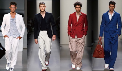 重形式出了名的Donatella也難得放下緊繃的神經, 這一季的Versace設計中雖然有光滑面料的細翻領西服,但是卻沒有領帶。更多的T恤以卷起袖口的形式出現,表現那種戶外運動的休閑氛圍。 Donatella表示,她希望春夏的男士能夠擺脫領帶的束縛,而是單純的享受活潑輕松的T恤時光。最有意思是,她的設計靈感來自于奧巴馬。