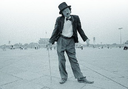 我遇見他是在天安門的前一天傍晚,在中關村南大街,人民大學東門,城市之光逐漸沉靜,戴帽子穿各色長袍的學生仍在各種石碑前留影,有一個奇怪的禮帽剪影低頭從學生中間穿過,向南走——卓別林的形象其實很脆弱,如果沒有身體姿態的配合,沒有那股勁頭,看起來就只不過是一個乞丐,一個流浪漢。