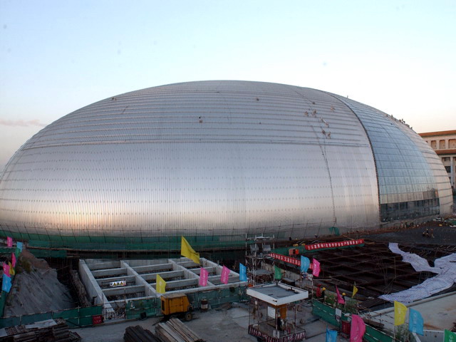 然而,要把法國建筑師的作品從圖紙變成現實,卻并不那么容易。建筑屋面呈半橢圓形,整個建筑漂浮于人造水面之上,行人需從一條80米長的水下通道進入演出大廳。由具有柔和的色調和光澤的最大跨度達212米的鈦金屬覆蓋只有0.44毫米厚!可見其技術難度有多大。