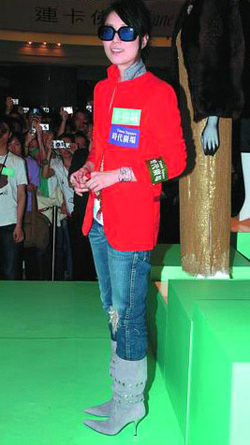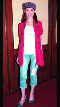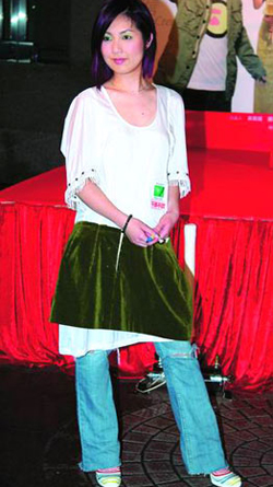 楊千嬅的牛仔褲顯然是經過自己剪裁,層迭短裙剛好讓人的視線集中到腿部,注意到仔褲。