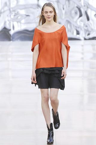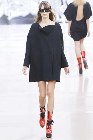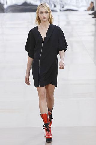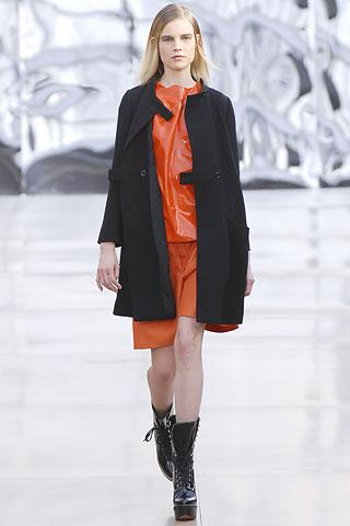 雖然背景的幕板上涂抹著類似魅影的詭異圖案,但亮相臺上的作品卻并非從屬另類路線,反而以簡樸、明凈、舒爽的素材用料試圖舒緩一下冬日的臃腫之感。Gemma Ward身上套著不合比例的拉鏈開襟薄質外衣,膝上的長度是靈活搭配的關鍵,單件穿著是性感的活力女郎,套穿也不失怡然大方。尼龍面料的反光效果十分有跨時空的意味,設計師更是積極調用十分搶眼的果橙和艷紅來重溫了一下俗艷的感召力。
