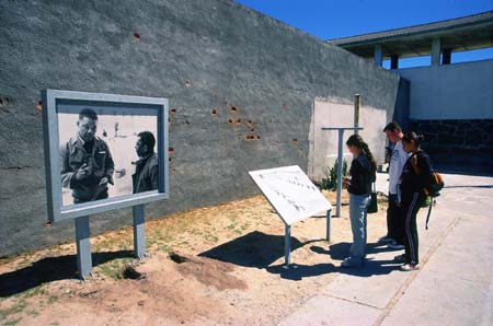渡輪轉過一對鐵鉗般的防浪堤后,停泊在默里灣碼頭。接待我們的是一位黑人導游,他自我介紹說他曾經也是被關押在島上的一名政治犯。踏上羅本島后,首先看到的是一個大牌子,上面用英語和阿非利加語寫著:“歡迎到羅本島”。我在一排灰色石板房前停下,拾級而上,走進第一道森嚴的大鐵門。陰森凝重的氣氛壓抑得人難以喘氣,似是步入地獄一般。在導游的引導下,我來到監獄的最東面———關押重刑政治犯的B區。慘白的日光燈照耀著“B區”牢房不到百米長的水泥地面通道,30間牢房空空蕩蕩地分列兩旁。在5號牢房門口,導游告訴大家,這就是曼德拉的牢房。他指著木門上的一個鐵牌子說,那上面原來標明犯人的編號和姓名,寫著“曼德拉/466/64”,它的含義是:曼德拉是1964年進入羅本島監獄的第466名囚犯。就在這間不足4.5平方米的牢房里,曼德拉度過了漫長的18個春秋。正因為有這樣鐵骨錚錚的人,羅本島總能讓參觀者在悲傷之外感到振奮。
