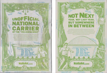 隨后,他們在《星期日泰晤士報》上刊登了一則整頁新廣告,一句斗大的話吸引眼球:“不是明年,不是去年,但是在中間這一年?!薄蠂H足聯的相關規定,在舉辦國沒有使用“2010”的字眼。畫面中心是一座橋——也沒有使用南非世界杯的球場形象,雖然橋的造型很像開普敦的世界杯球場。畫面上方做了很多高爾夫球基座,卻實際很像vuvuzela大喇叭的玩意兒,還標注道:“絕對絕對是高爾夫球座”。畫面四周環掛的布片,很像南非國旗,是否又違規?但它在旁邊標注道:“多彩海灘毛巾還是旗幟?”畫面下方,還有一個形體動作像是踢球的人,不過光著腳,標注更搞笑:“這是跑步鞋”。