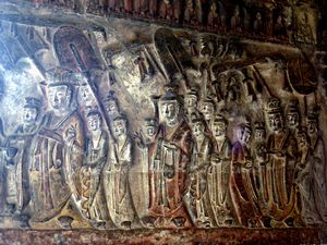 浮雕一段,刻一位帝王,頭戴冕旒,身穿袞服,在諸王、中官及手持傘蓋、羽葆、長劍、香盒的近侍宮女和御林軍的引導、簇擁下,緩緩行進的場面。另一段構圖類似,刻一位貴婦蓮冠霞帔,一手拈香,后隨兩個戴蓮冠的貴婦,在眾宮女的前導、簇擁下迎風徐行,方向與北段相對。圖中人物密集重疊,顧盼照應,既渾然一體,又有豐富變化。整幅浮雕采取橫向構圖,人形處理因此顯得頎長,并略帶向前的傾斜感,既保留了盛典中的帝王生活氣派,又帶有飄然如仙的宗教意味和凝然靜謐的心境。同時,宮女們含睇若笑,嬌慵前行的姿態,與整個虔敬肅穆的氛圍形成了含蓄的對照卻又溝通人世和天界。