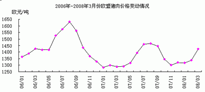 國際市場上,美國3月美國豬肉價格同比和環比均有所下降。據美國農業部統計資料顯示,美國豬肉市場供應充足。截至3月23日歐盟豬肉每噸平均價格為1423.59歐元,同比上漲10.39%,環比上漲6.50%。從今年1月底開始歐盟豬肉價格已連續保持了8周的小幅上漲,到第12周價格漲至1449.47歐元。隨著玉米、豆粕等飼料原料價格的不斷上漲,需求漸入旺季,致使歐盟豬肉價格開始迅速回升。