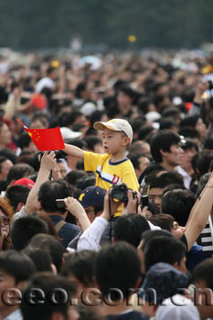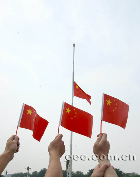 記者李平 康怡 林俐 胡中彬 我們13點40分到天安門廣場,看見很多人拿著相機在拍攝廣場上的半旗。有吊車停在廣場中心,穿著印有“抗震救災 眾志成城”黃色字樣的黑色體恤的拍攝人員在吊車上對天安門調鏡頭,國旗下也有同樣打扮的工作人員在調試鏡頭。三五輛警車在繞廣場巡邏。