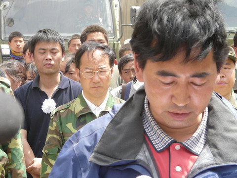 這是一個讓人悲憤而震撼的時刻。山上不斷有塌方和滑坡發生,碎石滾落,距離紀念會現場不足50米。石頭砸在附近的軍車上,發出金屬撞擊聲。在我身邊,所有人都沉默著,但是有幾個老人終于忍不住,低低的抽泣了。