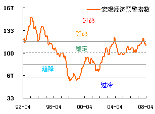 宏觀經濟預警指數以100為理想水平,“綠燈區”表示經濟運行處于正常區域。今年1月份以來,經濟已連續四個月處于“綠燈區”。分析人士認為,這意味著我國經濟由偏快轉向過熱的風險有所下降。