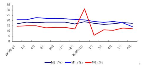 而從今年上半年金融運行數據看,2008年6月末,廣義貨幣供應量(M2)余額為44.31萬億元,同比增長17.37%,增幅比上年末高0.63個百分點,比上月末低0.7個百分點;狹義貨幣供應量(M1)余額為15.48萬億元,同比增長14.19%,增幅比上年末低6.86個百分點,比上月末低3.74個百分點;市場貨幣流通量(M0)余額為3.02萬億元,同比增長12.28%。在M2維持平穩增長的情況下,M1明顯下降,表明資金持續流入銀行體系,投資興趣減小,經濟的活躍程度明顯降低,有趨冷的跡象,未來經濟增長形勢不容樂觀。