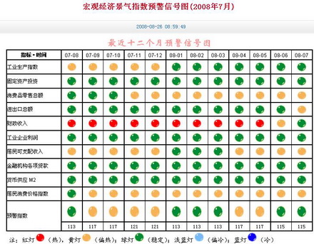 據統計局網站最新公布的最近12個月預警信號圖顯示,在對宏觀經濟各項指標的評估中,工業生產指數、固定資產投資、財政收入、工業企業利潤、、金融機構各項貸款、貨幣供應M2等指標在7月份處在穩定的“綠燈區”。其中,財政收入從07年8月到08年5月持續10個月過熱后,經過6月份的偏熱階段,7月份終于趨于穩定。