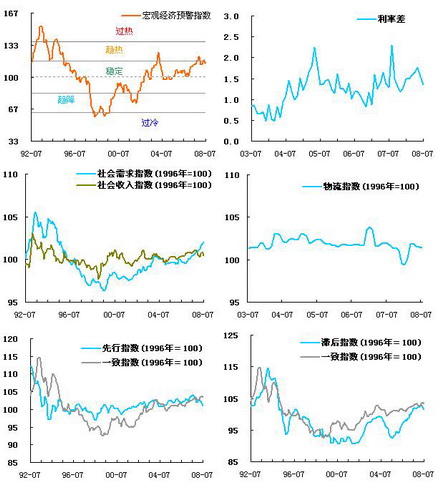 信號圖顯示,7月消費品零售總額、進出口總額、居民可支配收入和居民消費價格指數仍然處于偏熱的“黃燈區”。其中,居民消費價格指數自07年9月以來,已經連續11個月處于偏熱狀態。