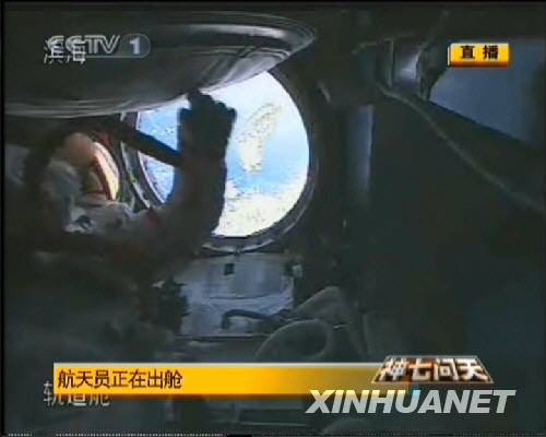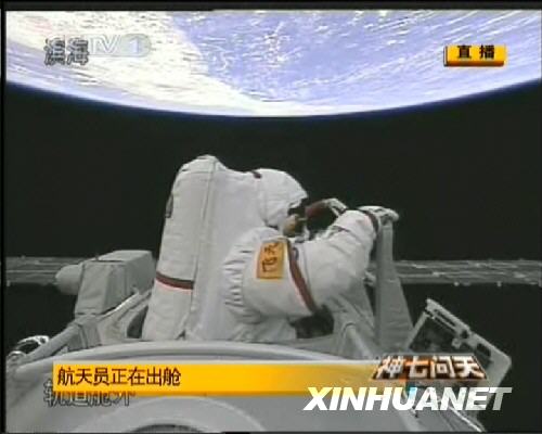 出艙被認為是神州七號旅程中的“重中之重”。9月27日16:39分神州七號軌道艙門打開,航天員翟志剛即將出艙。身穿120公斤重白色航天服的翟志剛開始出艙進入太空。翟志剛以頭先腳后的方式進入太空。隨即翟志剛向地面報告:“神舟七號已出艙,身體感覺良好,向全國人民,向全世界人民問候?!?并向攝像機揮手致意。