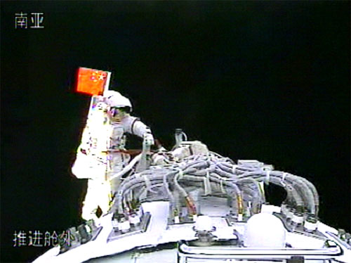 9月27日航天員翟志剛在太空對著攝像機揮舞國旗。