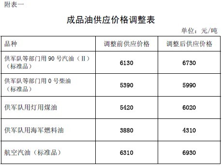成品油方面,成品油生產經營企業供軍隊及新疆生產建設兵團、國家儲備用汽、柴油(標準品,下同)供應價格每噸均提高600元,調整后的汽、柴油供應價格分別為每噸6730元和5990元。其他成品油價格相應調整。