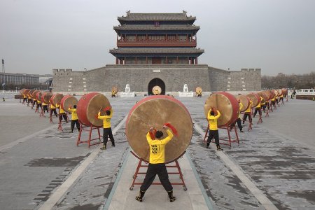 圖解:“綠色和平”聯同20名鼓手,在永定門城樓前擂響巨鼓,傳出中國在哥本哈根上的聲音。(LU GUANG/CANCAN 攝)