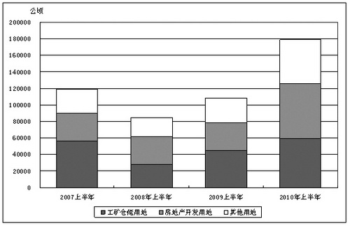 國土資源部中國土地礦產法律事務中心7月27日下午對外公布了2010年上半年全國土地供應情況的監測分析。根據該中心提供的數據,2010年上半年,全國31個?。▍^、市)土地供應總量為17.9萬公頃,同比增加65.1%。其中房地產開發供應量占到了總量的37.4%,達到6.6946萬公頃,同比增長幅度高達98.4%。