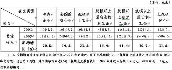 1、從營業收入看:國有企業營業收入總量大、增長迅速,民營企業營業收入增長更快、總量迅速提高。私營工業企業營業收入超過了國有及國有控股工業企業,加上股份制企業中的私營控股企業,全部私營及私營控股企業銷售收入可能已經占規模以上工業企業的一半左右。