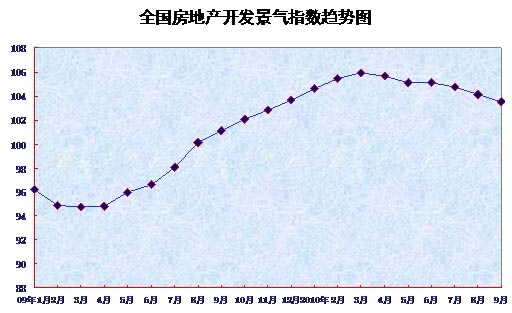 9月份,全國房地產開發景氣指數(簡稱“國房景氣指數”)為103.52,比8月份回落0.59點,比去年同期提高2.44點。