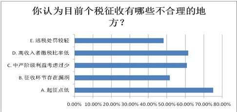 在經濟觀察網的調查中,對于目前個稅不合理的因素,網友依次給的選擇是:起征點低(75.1%)、高收入者繳納比例低(61.67%)、中產階級利益考慮過少(60.8%)、征收環節存在漏洞(51.69%)、逃稅處罰較輕(48.18%)。