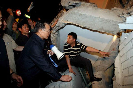 溫家寶在都江堰市一所醫院的廢墟中,透過縫隙向埋在里面的人喊話