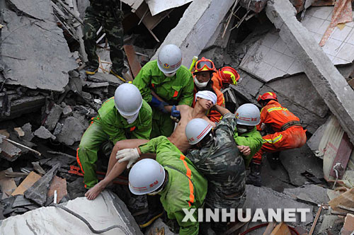 這是俄羅斯救援隊與被困者的對話。17日21時16分,俄羅斯救援隊只用了16分鐘就把一名幸存者從兩層樓夾縫中成功營救出來。這是國際救援隊在中國營救出的第一位幸存者。