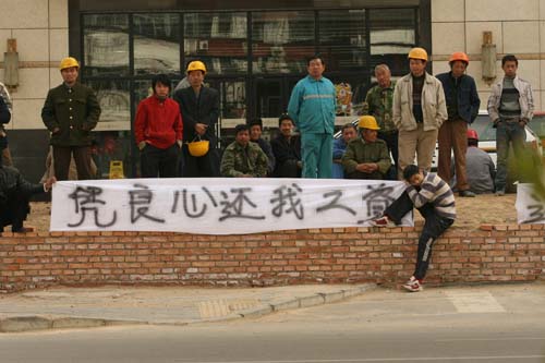 經濟觀察網 記者 盛超 3月16日15時左右,在距離北京奧林匹克體育中心300米的地方,一個名為奧東18號的尚未完成的樓盤前聚集了上百名農民工。他們手舉的白色條幅上寫著“憑良心還我工資”、“還我血汗錢”。