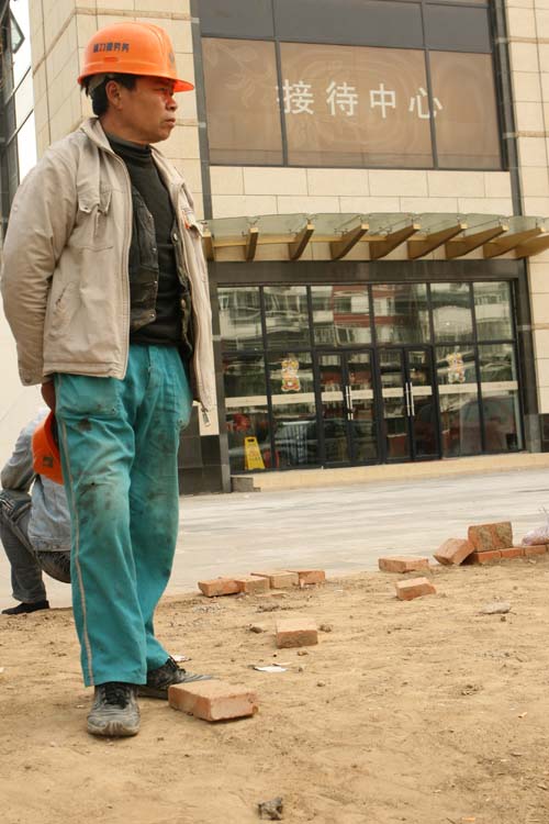 透過售樓接待處的大玻璃門,可以看見里面擠滿了身穿筆挺制服的保安緊張地注視著樓前聚集的民工?!叭ツ甑拙烷_始欠我們的工資、施工費,過年的時候我們在這里坐了一個星期,才給了我們40%,說好其余的過年回來給。到現在,過了這么長時間,開發商不理我們了?!笔┕り犂镆晃恍詹艿墓芾碚咧钢鴺莾鹊谋0舱f,“開發商寧肯花錢雇這么多保安,也不愿意給我們工資?!?/FONT>