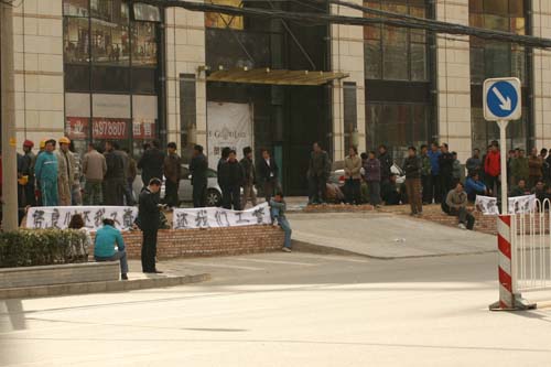 汪先生說,他們是早上就來到這里等待和開發商溝通,但對方除了派出保安阻止農民工進樓以外,沒有任何人來就拖欠的工資問題進行協商。