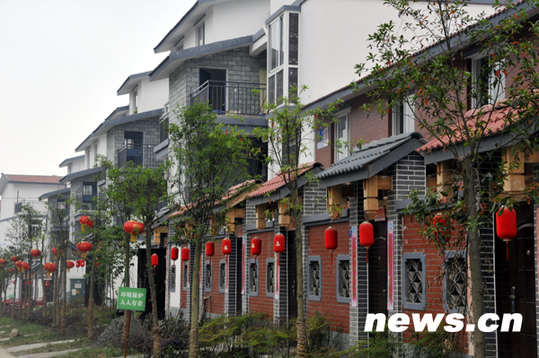 5月7日,都江堰市向峨鄉棋盤村重建的永久性住房安置點。目前,四川地震災區災后重建的一批永久性安置住房陸續竣工,各具特色。不少受災群眾喜遷新居。