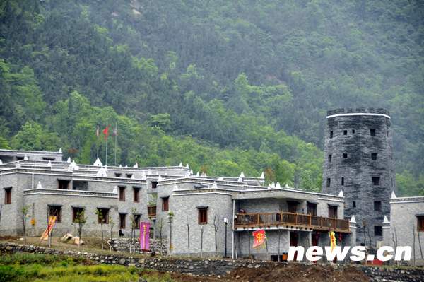 5月9日,“吉娜”新羌寨全貌。在去年5.12特大地震中遭受嚴重破壞的北川擂鼓鎮貓兒石村“吉娜”羌寨,在山東省濟南市對口援建下,從廢墟上拔地而起,69戶原“吉娜”羌寨居民今年春節前重新搬回新寨,遷入新居。
