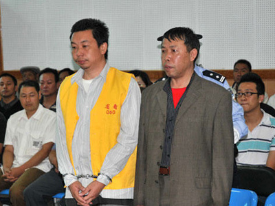 (8月6日,被告人李東明(前右)、蘇紹錄(前左)在嵩明縣法院受審。)