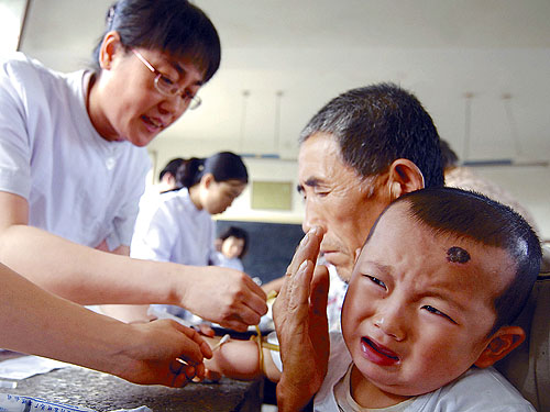 8月11日,在鳳翔縣長青鎮高咀頭村,醫務人員正在為小朋友抽取血樣,準備檢測血鉛。新華社/圖