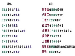 經濟觀察網 記者 周靚 據人民網報道,2009年11月至2010年4月的六個月時間內,全國先后有八個省市區黨政主要負責同志出現調整,其中福建、河南、遼寧、內蒙古、新疆、湖南調整了省(區)黨委書記,重慶市更換市長,吉林省則省委書記、省長兩職均發生變化。